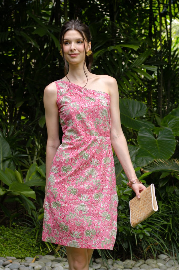 The Komal dress is a playful yet chic one-shoulder style made from 100% breathable cotton fabric. With a sleeveless style top and a slight slit on the skirt for added flair, this easy to wear dress combines effortless style with a touch of Hawaiian elegance, perfect for festive getaways and sunny days.
